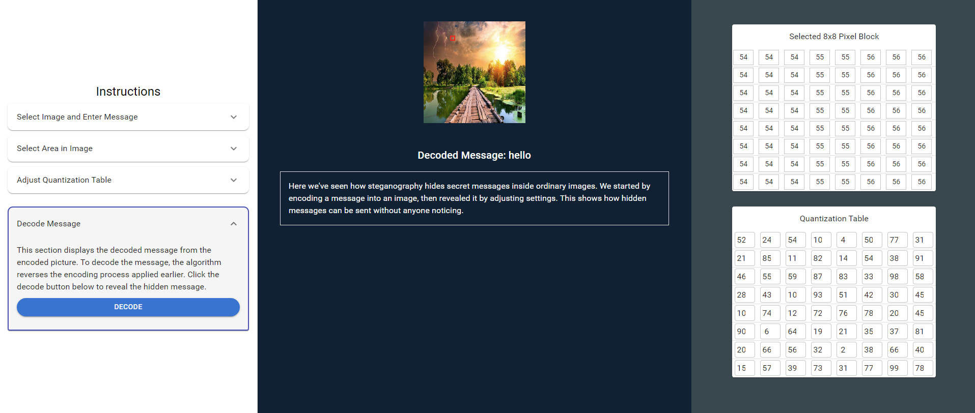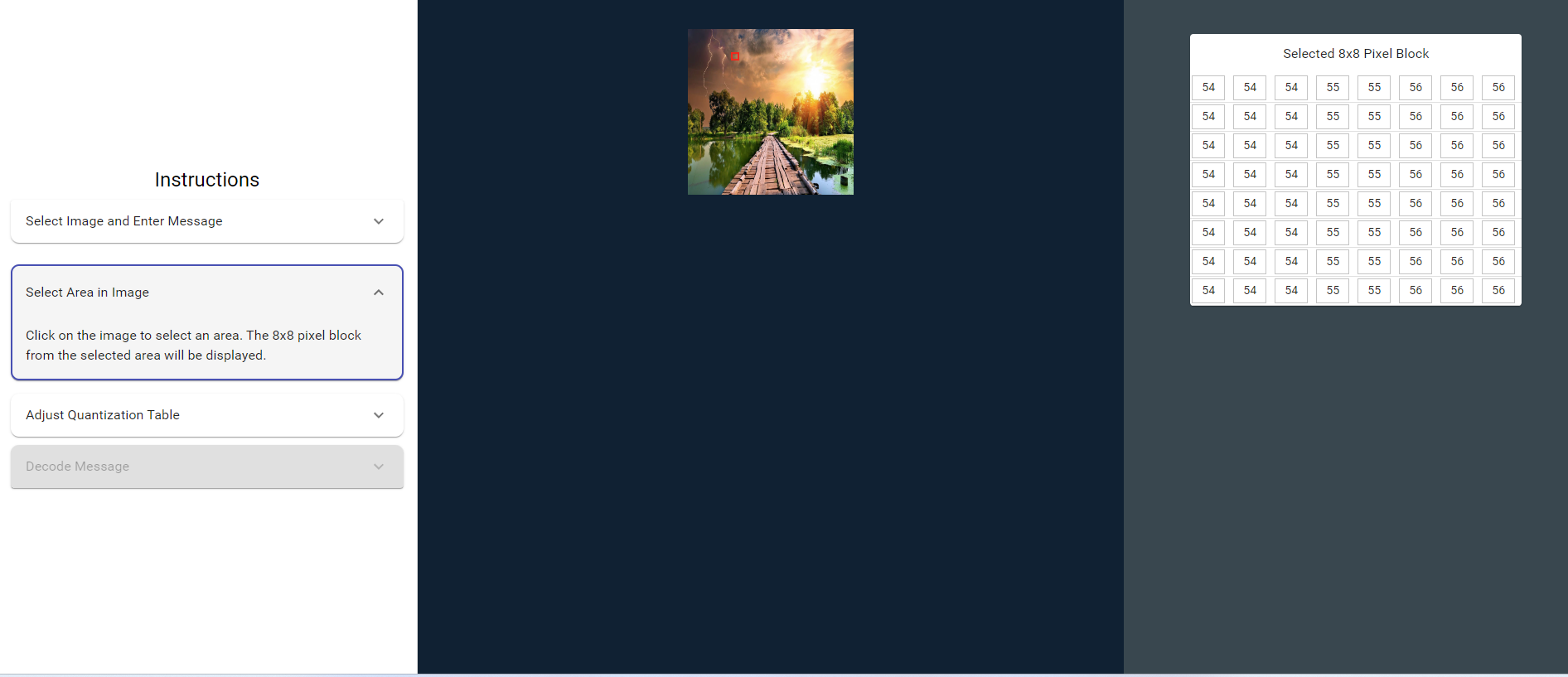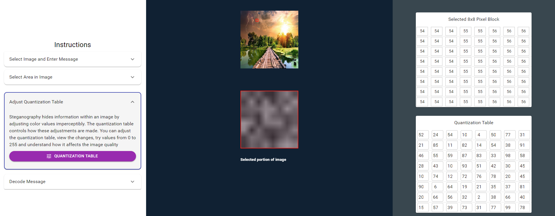 3. Click the "Quantization Table" button, adjust the values, and analyze the changes in the selected image portion.